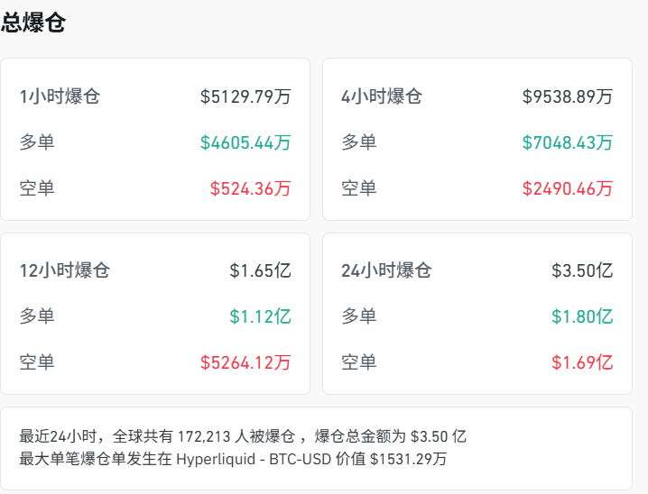 加密货币方面,多数币种下跌,截至23:03,比特币小幅度下跌,HYPE跌超4%,狗狗币跌近3%,过去24小时内超17万人爆仓。