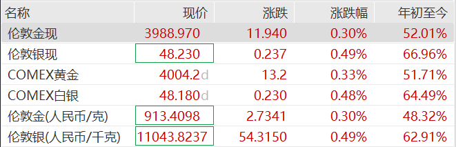 贵金属方面,现货黄金保持微弱涨幅,截至发稿报3988.97美元/盎司,日内涨0.3%。COMEX黄金报4004.2美元/盎司。