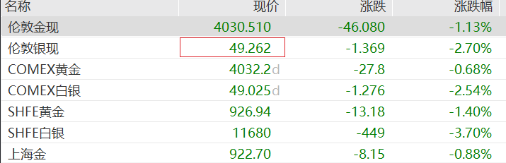 大宗商品方面,伦敦金现跌1.13%报4030.51美元/盎司,伦敦银现跌2.7%报49.262美元/盎司。
