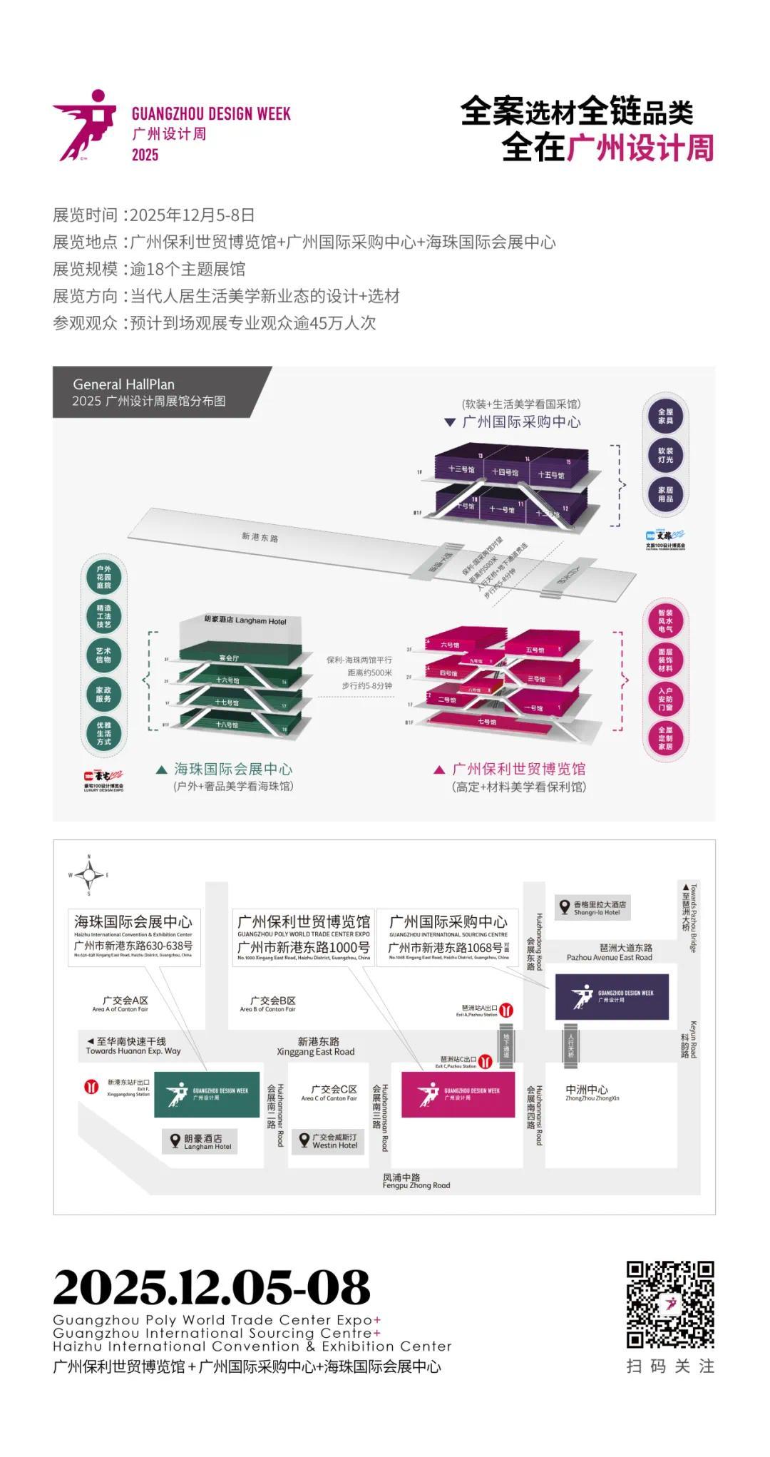 2025广州设计周以“亲爱”为主题,于2025年12月5-8日(四天)在保利馆 国采馆 海珠馆三馆盛大举行,展览方向聚焦“当代人居生活美学新业态的设计 选材”,展览规模达18个主题展馆之多,全球超20 国家的逾1000 家涵盖设计/文创/艺术/潮流/家居/软装/高定/智能/材料/户外/生活方式等领域的领先品牌厂商和机构参展展出,涵盖人居空间全案所需“外装-内装-后装”的超全供应链和服务链,包含:“户外花园庭院—精造工法技艺—智装风水电气—面层装饰材料—入户安防门窗—全屋定制家居—全屋家具—软装灯光—家居用品—艺术信物—家政服务—优雅生活方式”的人居全案选材全链品类,分类设置于保利馆 国采馆 海珠馆,形成“高定 材料美学看保利馆、软装 生活美学看国采馆、户外 奢品美学看海珠馆”的展会格局,逐步完善“全案选材全链品类全在广州设计周”的展会平台构建,为全案设计选材选品搭建一站式营商互动平台。