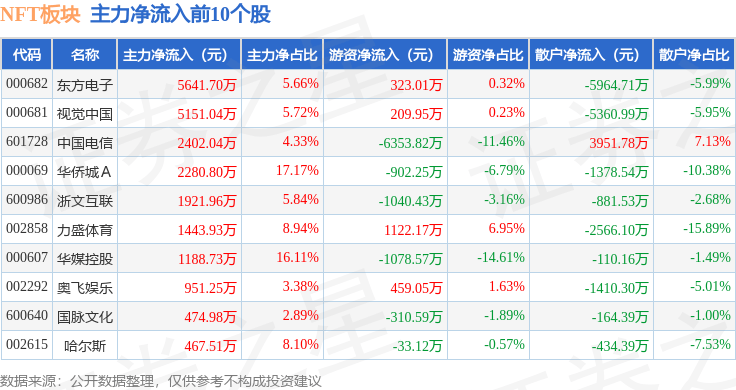 从资金流向上来看,当日NFT板块主力资金净流出17.71亿元,游资资金净流入2.94亿元,散户资金净流入14.77亿元。NFT板块个股资金流向见下表: