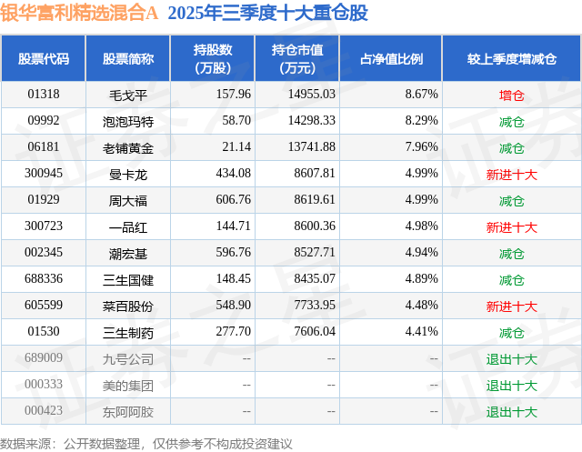 根据2025基金Q3季报公募基金重仓股数据,重仓该股的公募基金共7家,其中持有数量最多的公募基金为银华基金的银华富利精选混合A。银华富利精选混合A目前规模为17.23亿元,最新净值0.6113(11月7日),较上一交易日下跌2.38%,近一年上涨6.54%。该公募基金现任基金经理为焦巍 秦锋。焦巍在任的基金产品包括:银华富裕主题混合A,管理时间为2018年12月27日至今,期间收益率为103.6%;银华富饶精选三年持有期混合,管理时间为2021年5月28日至今,期间收益率为-38.25%;银华富久食品饮料精选混合(LOF)A,管理时间为2021年9月3日至今,期间收益率为-42.63%。秦锋在任的基金产品包括:银华中证全指医药卫生,管理时间为2017年9月28日至今,期间收益率为34.95%;