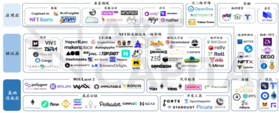 应用层:主要由基于协议层而产生的通证而衍生出来的应用为主,比如泛二级市场代表项目OpenSea