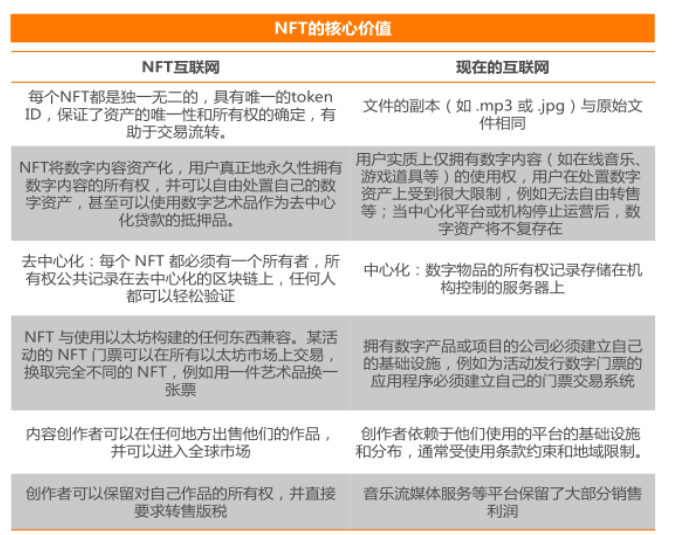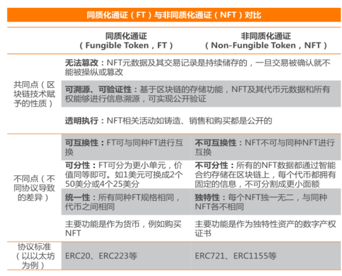 FT是同质化通证(FungibleToken),NFT是费同质化通证,《2021年NFT行业概览:文化与社交的数字确权价值》[3]报告解析了NFT和FT的共同点和不同点