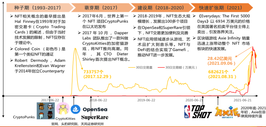 NFT的雏形是2017年以太坊中的CryptoPunks的像素头像项目,总量不超过1万且每一个都是独特的,拥有以太坊钱包的人都可以免费领取并可以拿到二级市场交易。2018年诞生的全球首款区块链游戏CryptoKitties(加密猫)就是基于以太坊ERC721协议开发的。该游戏中,玩家拥有的每一只虚拟猫咪都是独一无二的,且无法被复制或销毁,其本质上就是NFT,而部分稀有的高人气猫咪身价甚至高达数十万美元。NFT由于其非同质化、不可拆分的特性,使得它可以和现实世界中的一些商品绑定,由于NFT具备天然的收藏属性且便于交易,加密艺术家们可以利用NFT创造出独一无二的数字艺术品。虽然目前NFT主要应用在艺术领域,但从理论上来讲,NFT可以应用于任何数字化的东西,包括文字、图像、音频、视频、游戏道具、数字艺术品、门票,等等。据DappRadarr的数据,2020年到2021年2月,全球NFT市场的交易额为1.7亿美元,而2021年上半年NFT的全球销售额达到25亿美元,2021年8月首周全球NFT艺术品的交易额达到4.43亿美元,相当于2020年全年交易额的近三倍。